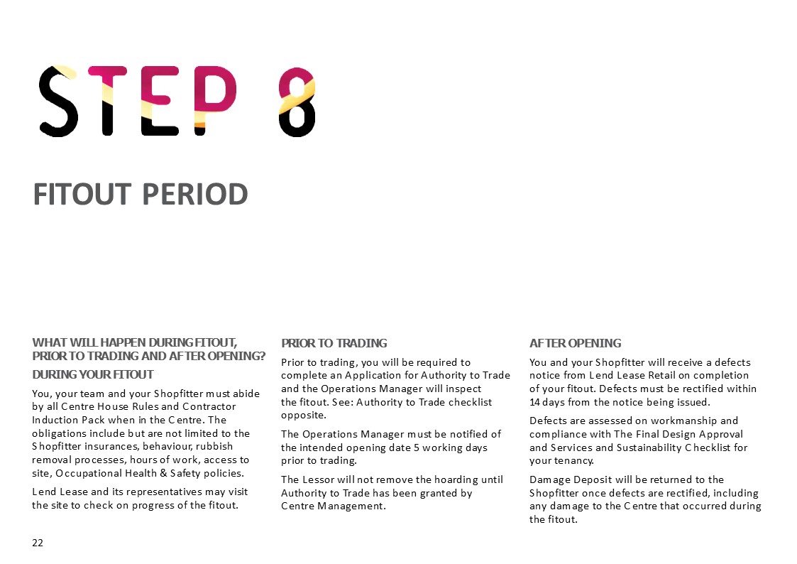 This guide is designed to help retailers and designers understand the requirements for constructing a fitout within a Lend Lease shopping centre. It is essential reading whether you are building a new fitout or refurbishing an existing one.