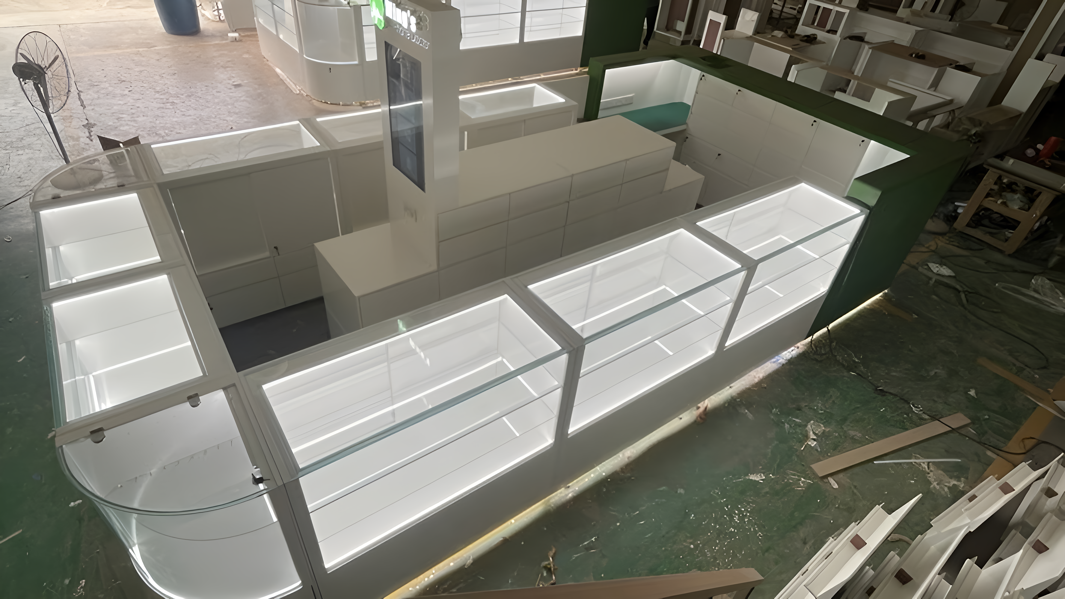 • Smart Layout & Workflow: The phone kiosk maximizes the limited space with a logical zones: a well-lit product display area to attract customers, a spacious storage section for parts and tools, and a dedicated, efficient repair operation desk for technicians.