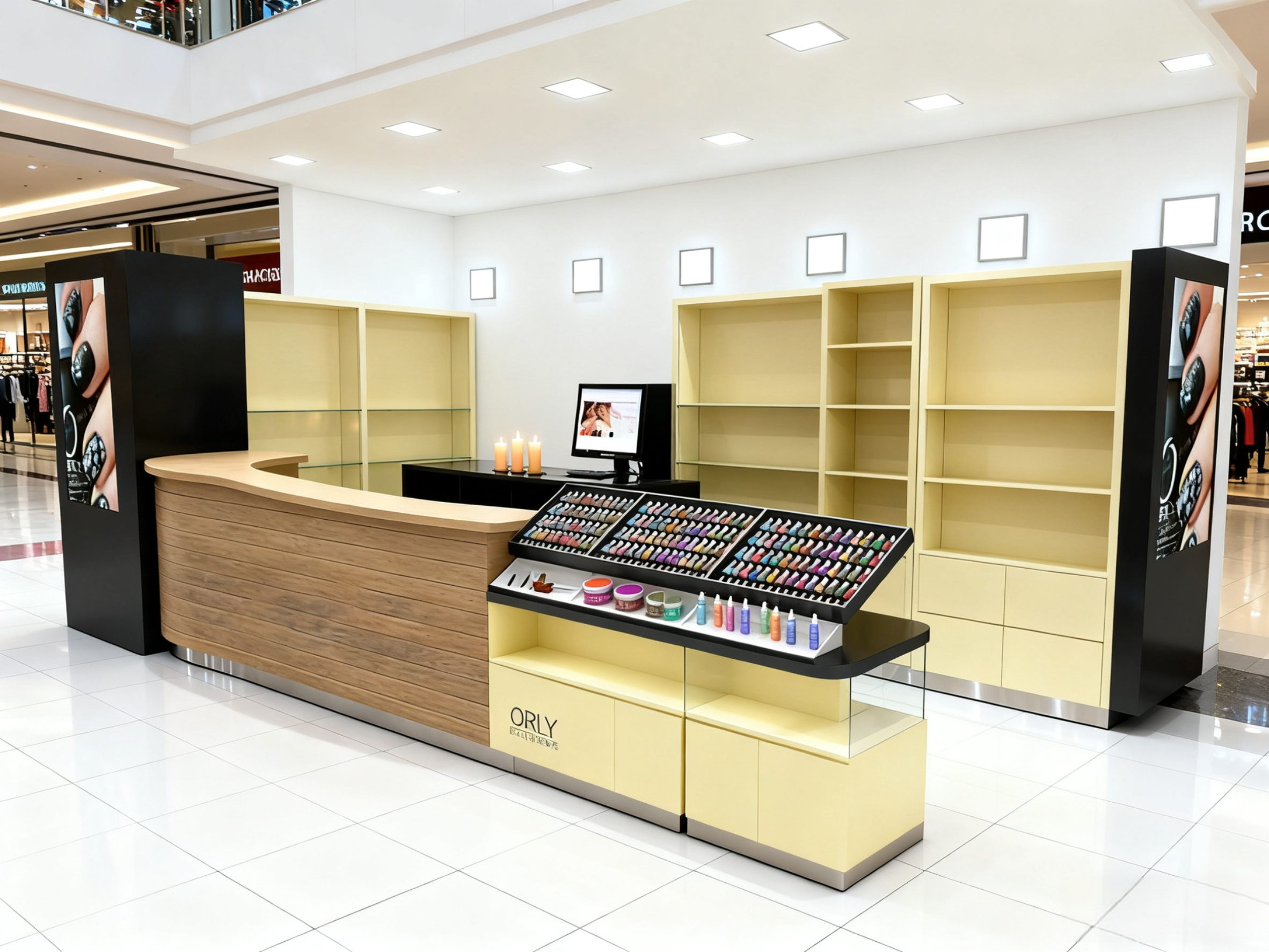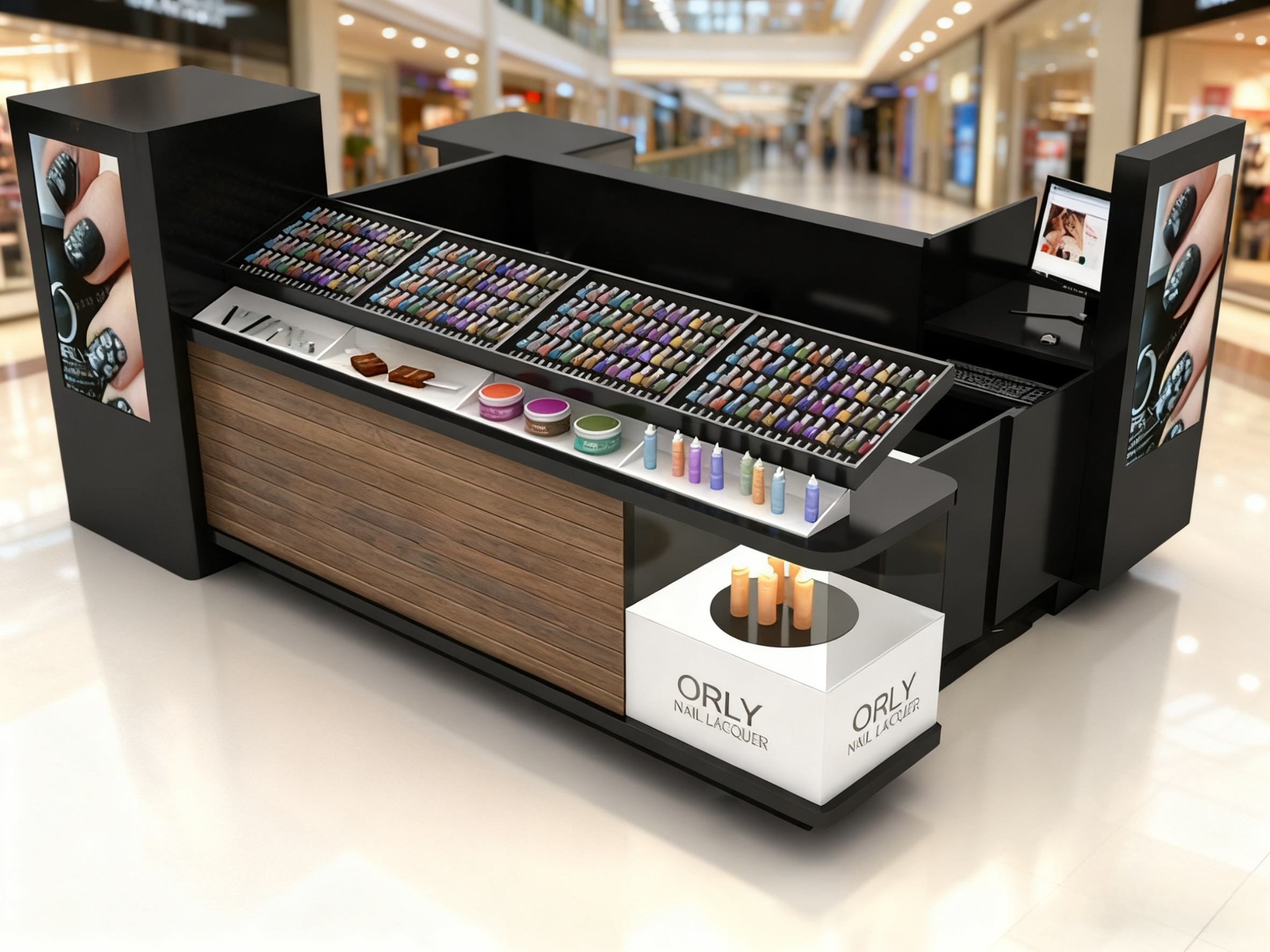 Our client needed a 3×4m nail kiosk mainly for nail product retail in a shopping mall. The design had to include display showcases, a reception cashier counter, lightbox signage, custom brand logo, and ample storage space.