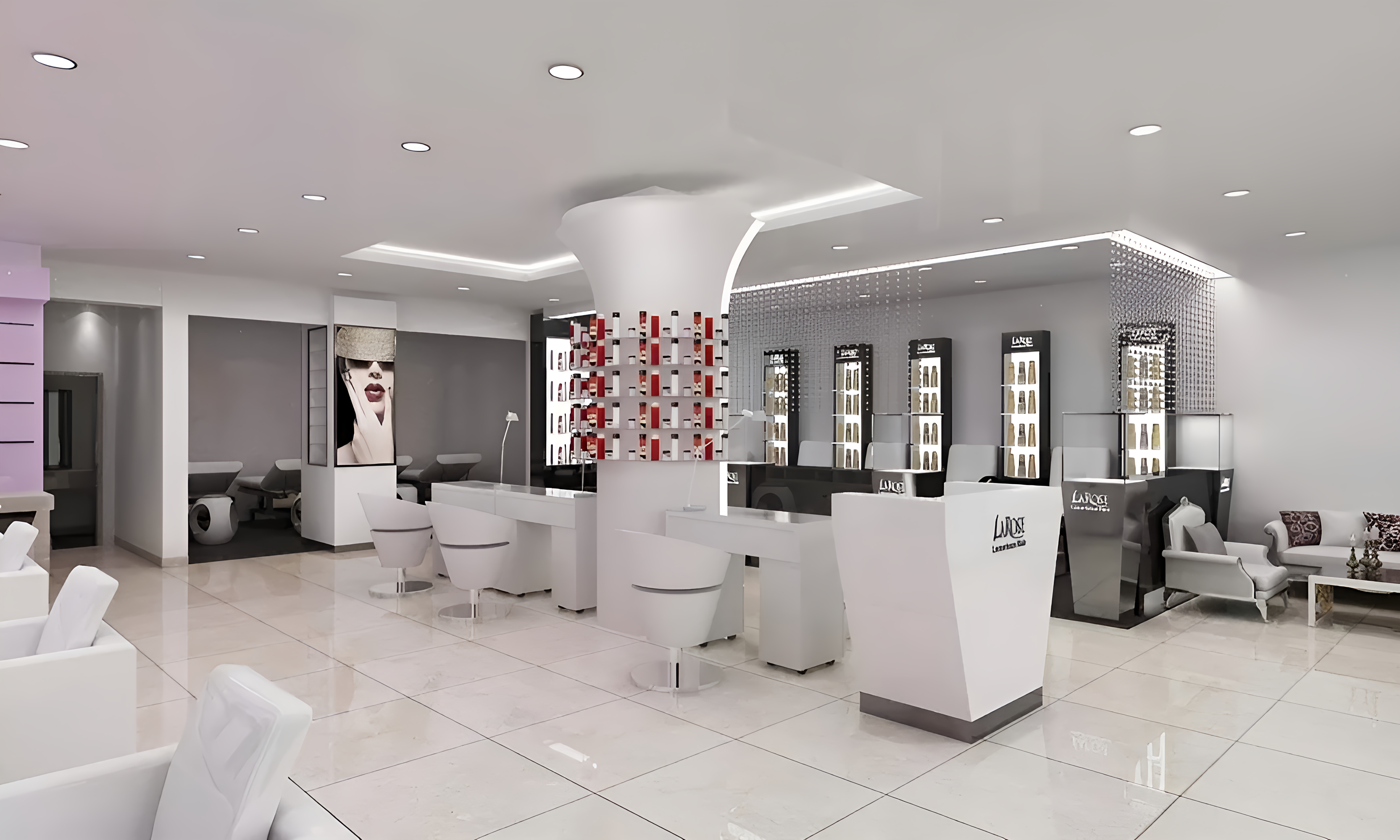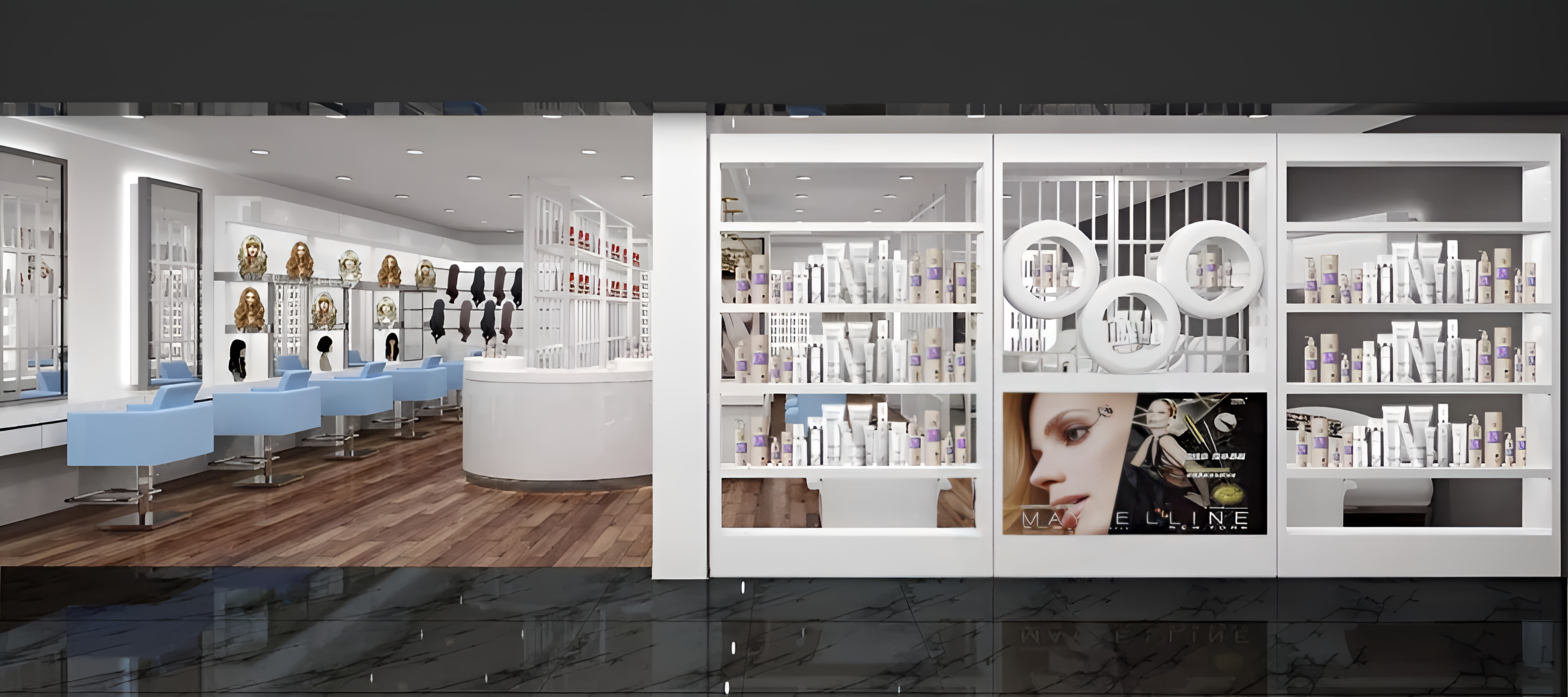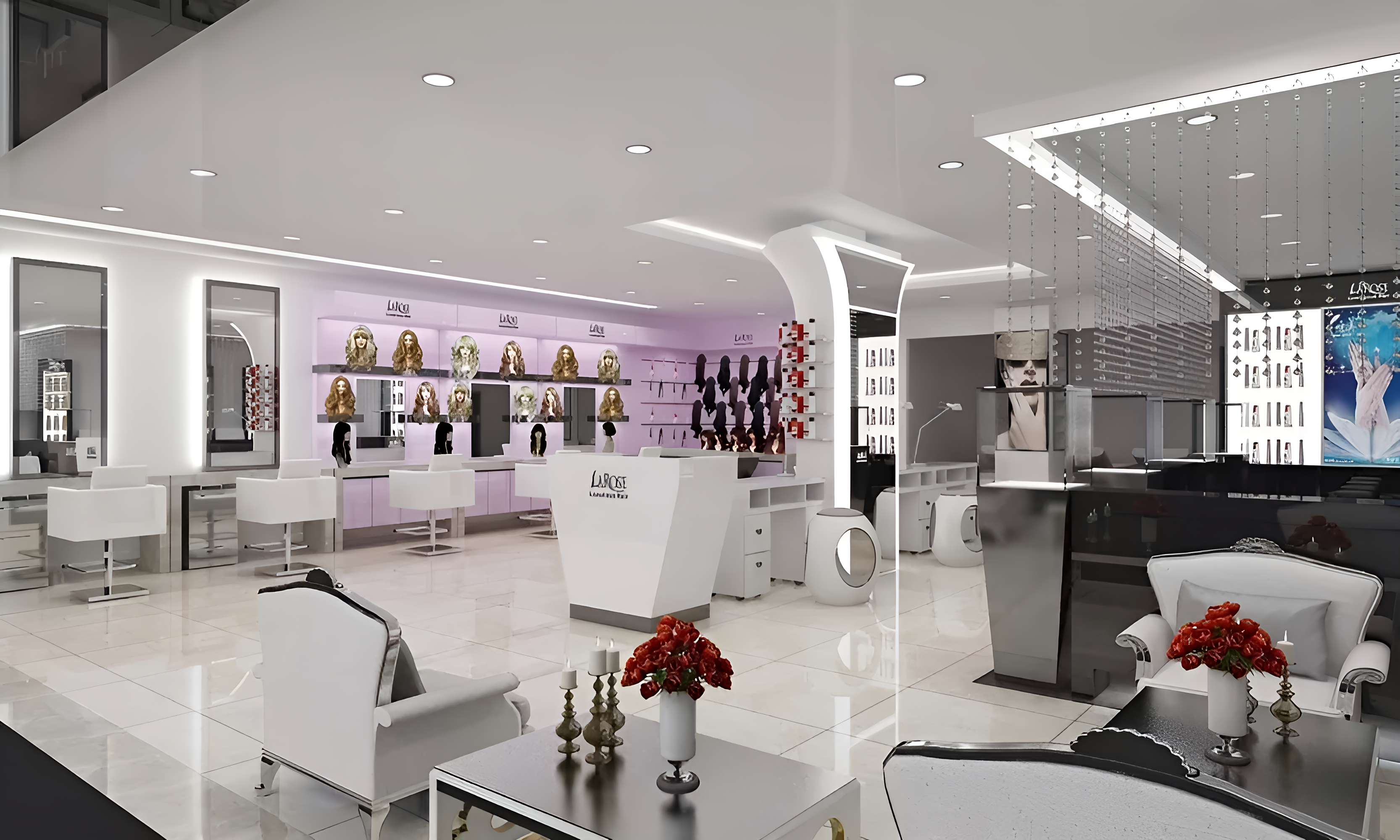 M2 Display provided end-to-end, custom store design and build services for two La Rose Hair Shop locations. This premium hair salon project features a minimalist white color scheme, executed with high-quality MDF and wood paint finishes. The comprehensive layout includes dedicated styling, waiting, VIP lounge, cashier, shampoo, and restroom areas. M2 Display’s space-saving solution cleverly uses shelf-style partitions to define zones, offering both customer privacy and enhanced retail display and storage capacity for products. This project showcases our expertise in delivering sophisticated, full-store kiosk solutions for the hair and beauty industry.