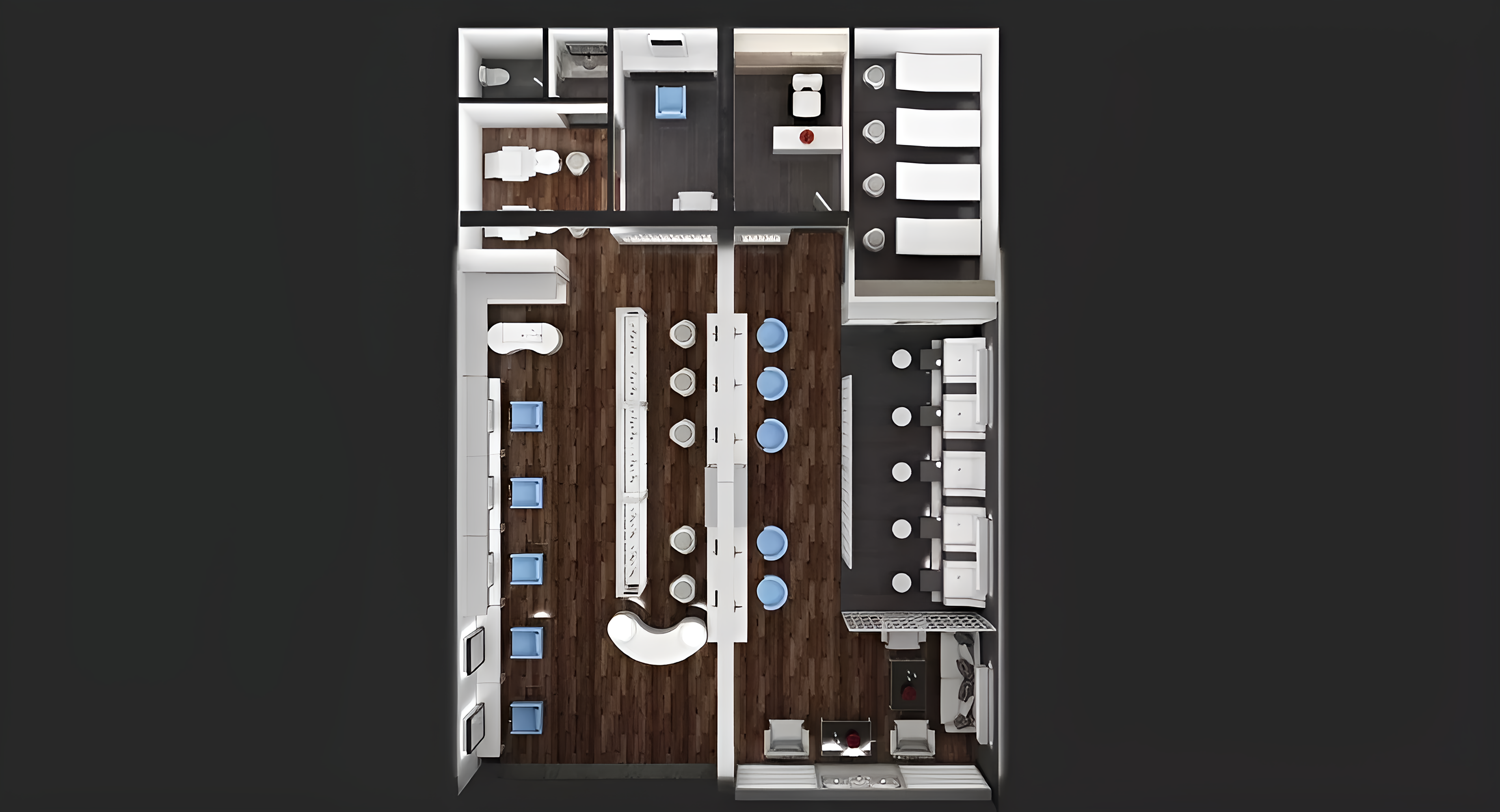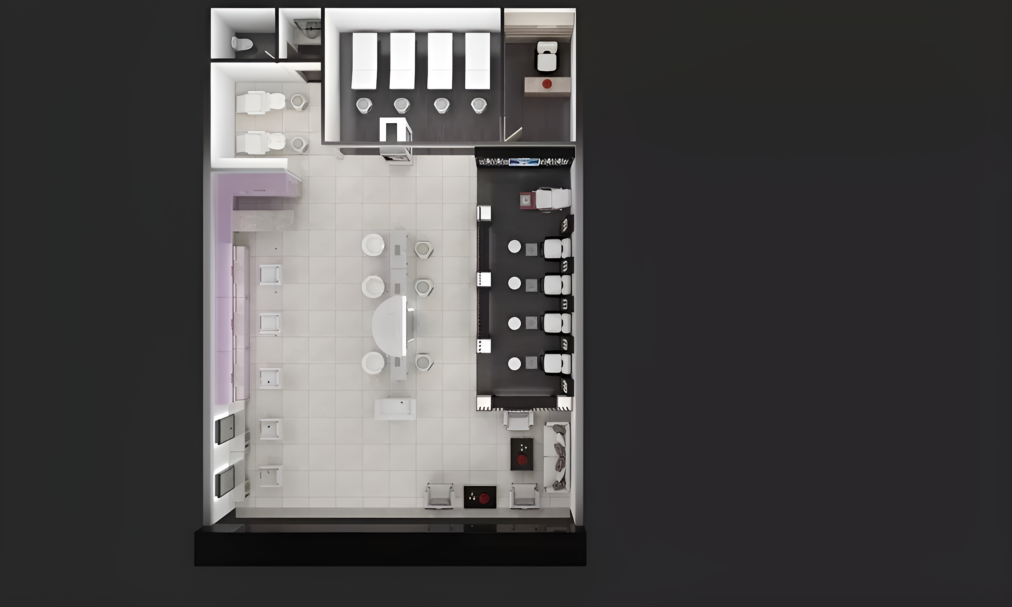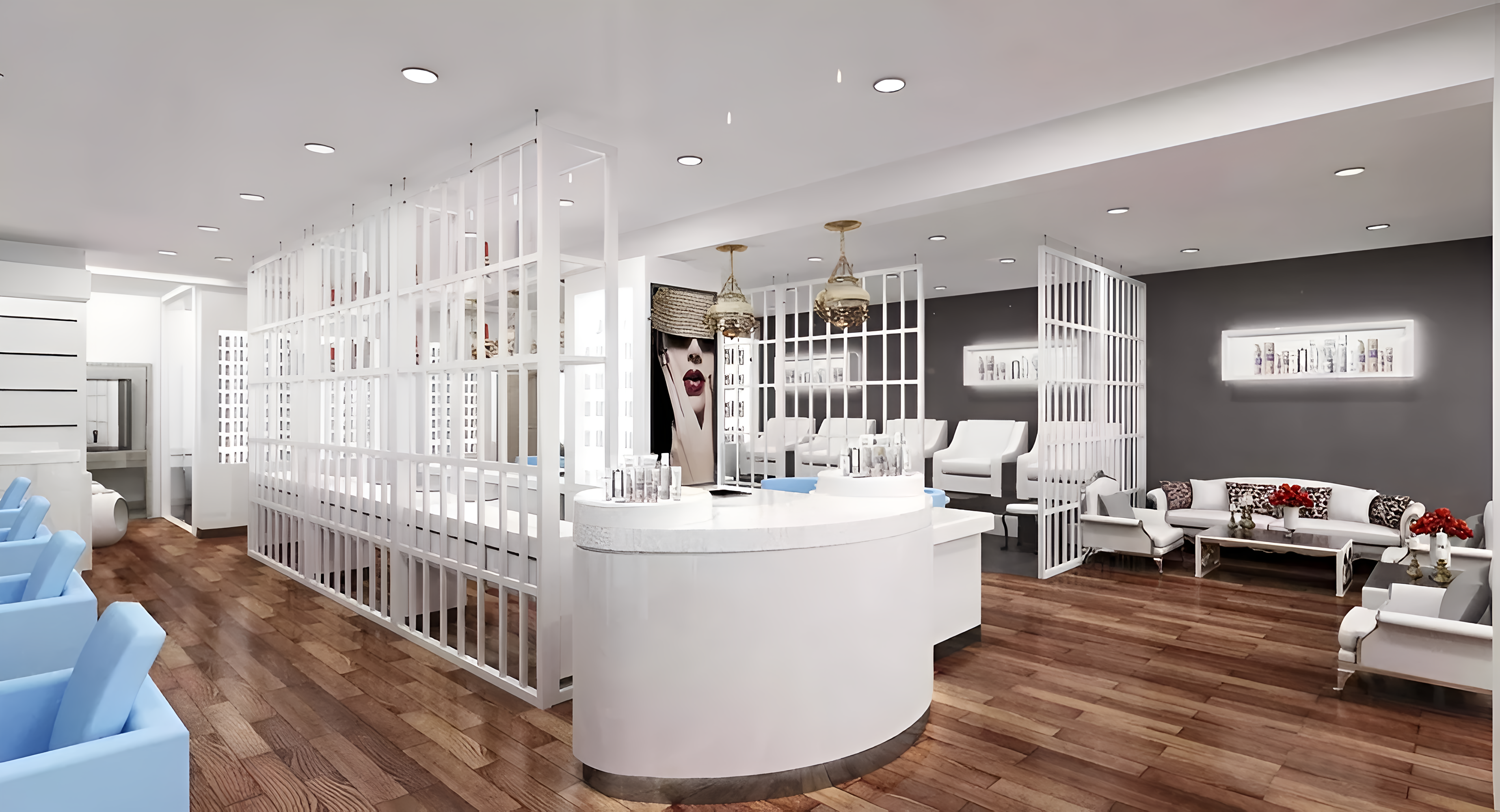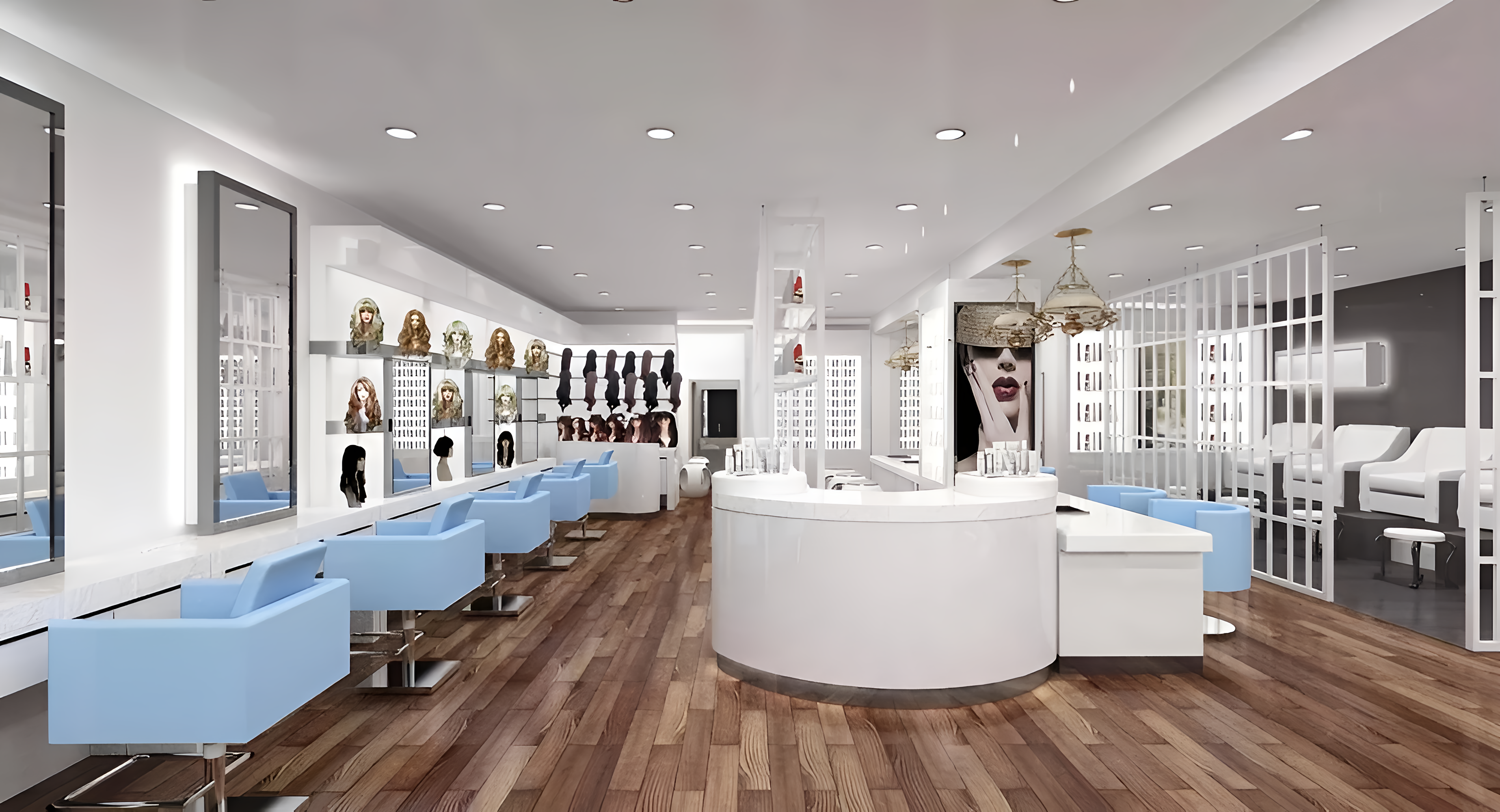 M2 Display provided end-to-end, custom store design and build services for two La Rose Hair Shop locations. This premium hair salon project features a minimalist white color scheme, executed with high-quality MDF and wood paint finishes. The comprehensive layout includes dedicated styling, waiting, VIP lounge, cashier, shampoo, and restroom areas. M2 Display’s space-saving solution cleverly uses shelf-style partitions to define zones, offering both customer privacy and enhanced retail display and storage capacity for products. This project showcases our expertise in delivering sophisticated, full-store kiosk solutions for the hair and beauty industry.