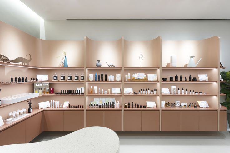 Our design features illuminated display cabinets in a soothing soft pink color, with warm white lighting that highlights beauty products. These cabinets create an eye-catching display, making each product stand out and enhancing the overall shopping experience.