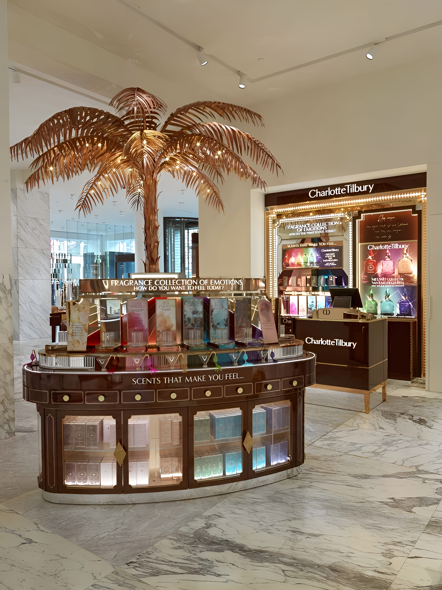 This bold foundation is artfully balanced by the introduction of soft, blush-pink central islands and sleek leather display cases. These elements introduce warmth, texture, and a contemporary edge. The pink islands, often dedicated to new collections or skincare, invite casual browsing, while the leather units add a tactile, bespoke feel. The overall layout is a study in intuitive zoning, clearly separating the immersive, service-driven “transformation zone” from the explorative “discovery zone,” all while maintaining a cohesive and inviting brand environment.