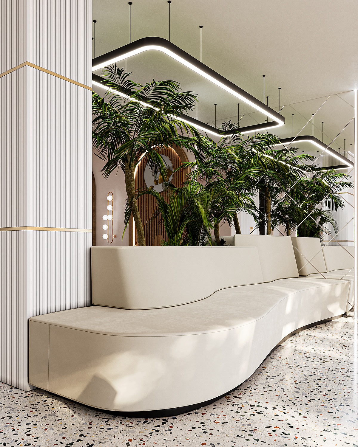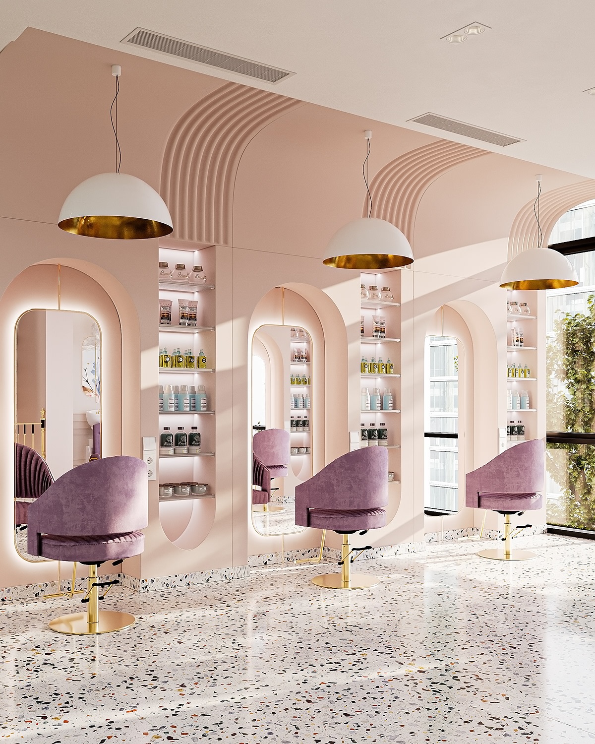 This hair salon design combines style, functionality, and comfort, offering an ideal space for modern, upscale salons.