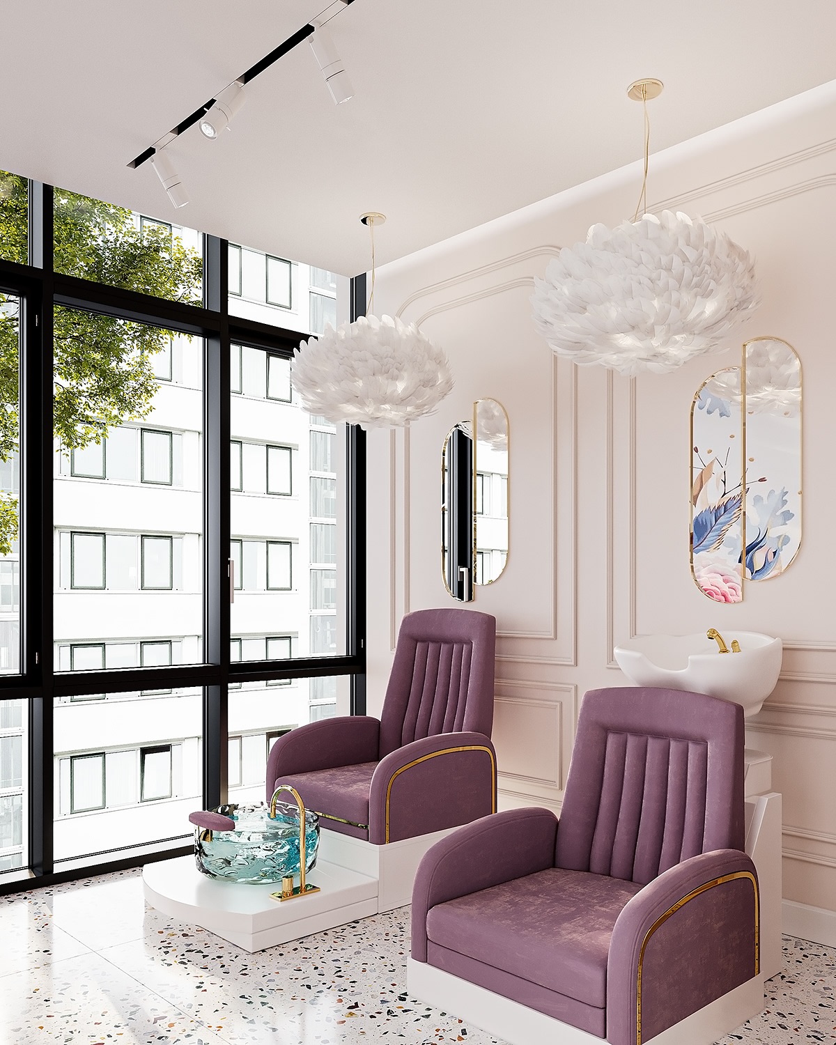 The foot spa area features plush rose-purple foot chairs, providing a serene space for clients to unwind while enjoying spa services. This area complements the overall aesthetic while offering additional comfort and luxury.